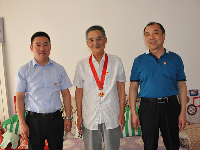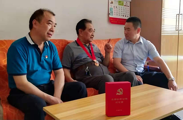 在黨的百年華誕即將到來之際,6月23日,隊黨委書記袁勝超、紀委書記楊顯文上門為老黨員頒發(fā)“光榮在黨50年”紀念章。