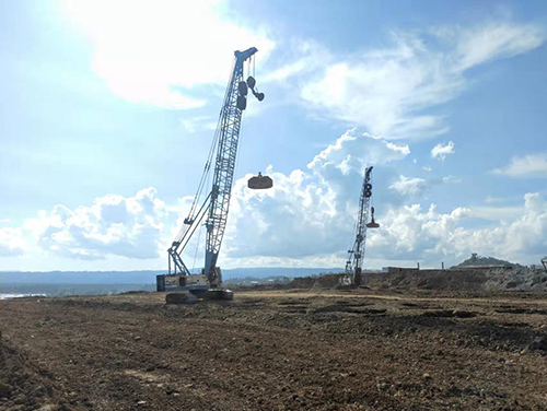 面對工程難度大、工期緊的局面,項目部本著對業主負責的原則,科學組織、周密部署,以高質量建設,嚴標準管理,樹立責任意識、質量意識和精品意識,以極大的熱情和扎實有效的工作投入到項目建設中來。為了應對區域回填土質差無法施工的問題,項目部與甲方協商后采用在填土層上鋪設碎石料的方法,有效解決了泥濘場區強夯施工難題。為了追趕工期,項目部在原有3臺夯機施工的基礎上,攻堅克難,積極籌備,再次增添2臺強夯設備,并組織人員加班加點全力施工,大大提高了施工進度。
