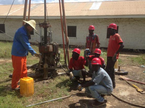 由于該區(qū)域地層是異常堅 硬的輝綠巖,施工伊始工作人員就遇到了困難,鉆進相當(dāng)緩慢。機長時良橋邊干變分析原因,根據(jù)實際情況,對連體泥漿泵進行了改良,提高了施工效率,但這還是沒能達到讓項目組滿意的施工效果。為了確保按時完工,大家不得不取消了午休時間,加班加點施工。后來項目組第二批成員抵達南蘇丹后也立即將背包鉆機投入到朱巴醫(yī)院詳勘工作,大小兩臺鉆機配合,進度有了很大提高。