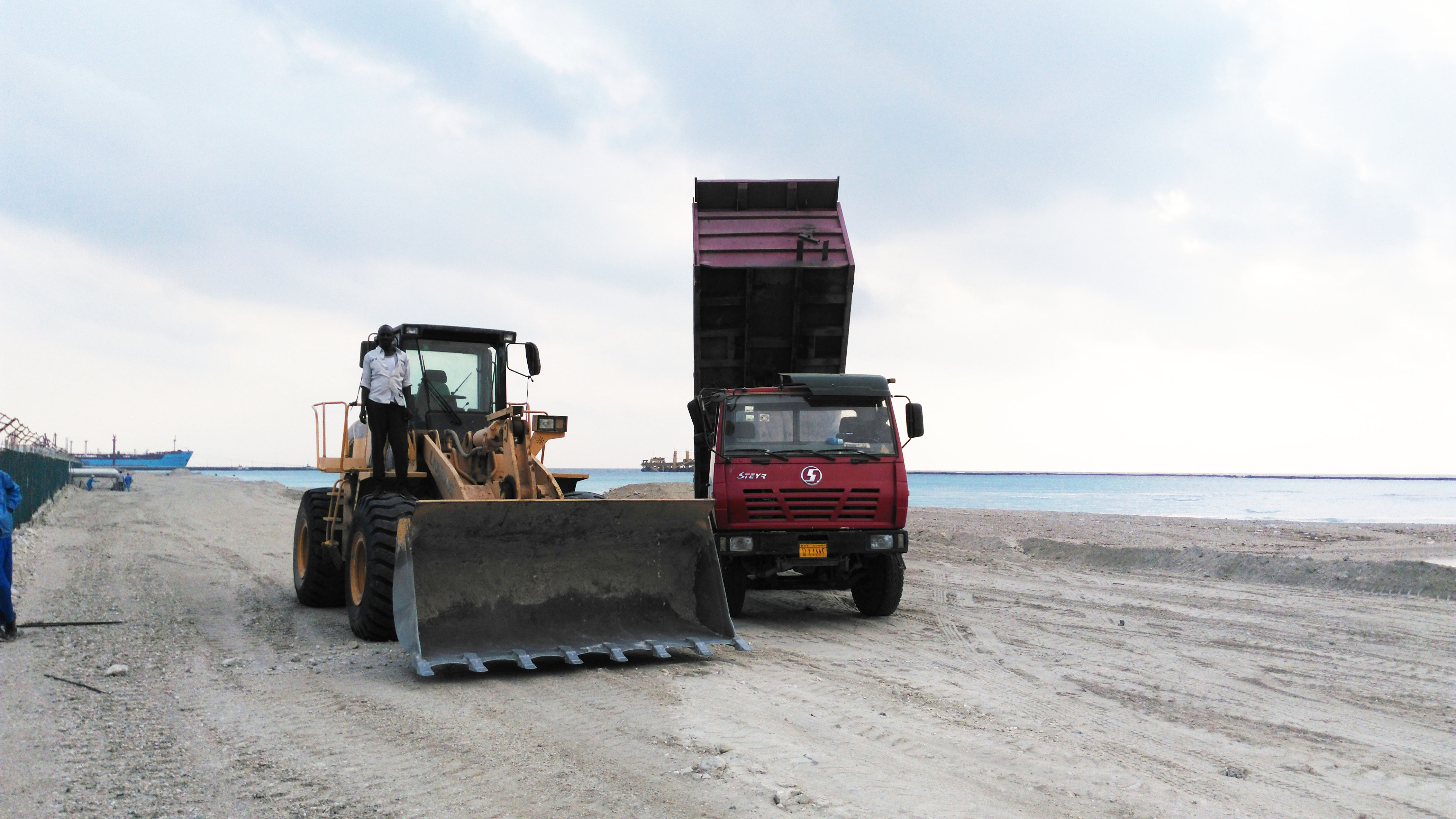 前期人員首先進場對施工場地進行了考察并把現(xiàn)場情況及所涉及的問題報告給總部。其余的管理與施工人員于2015年11月19日全部進場。目前,該項目進展順利。該工程位于蘇丹港達(dá)瑪油碼頭廠區(qū)內(nèi)部,緊鄰海邊。為二期引堤工程,屬于斜坡式防波堤,堤身長約950m,采用拋石護腳結(jié)合漿砌石護面的形式進行護坡。引堤施工斷面為1:2坡比,坡面從下往上分別是土工布,400mm的倒濾層,400mm的片石墊層,600mm的拋石(A-B段,C-D段)或800mm的漿砌石(B-C段)。