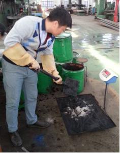 進行試驗首先要研制出合適的固化劑,研究組在今年4月開始了固化劑選型試驗。研究人員采用數(shù)十種有機、無機化學(xué)試劑按照不同組合、不同配比、在不同溫度下進行了試驗,選取最佳試劑組合及固化工藝,經(jīng)歷過數(shù)十次失敗,在修改了多次固化機理的方向后,終于在5月27日取得突破,研配出一種具有良好固化脫水、脫粘效果的固化劑。這種固化劑能使油泥砂在24小時內(nèi)含水量由64.8%降至15.5%,固化后樣品呈酥脆狀、手捏即碎,高位發(fā)熱量3269大卡(平頂山煤4500大卡),達到燃煤熱值的70%左右,利用價值高,完全可以與燃煤攪拌均勻,摻入燃煤中進行焚燒,用作燃煤鍋爐燃料。按照初試試驗估算處理成本計算,這種方法能使每噸油泥砂處理成本降至500元/噸以下,不到國家收費標準的一半,具有良好的經(jīng)濟性。