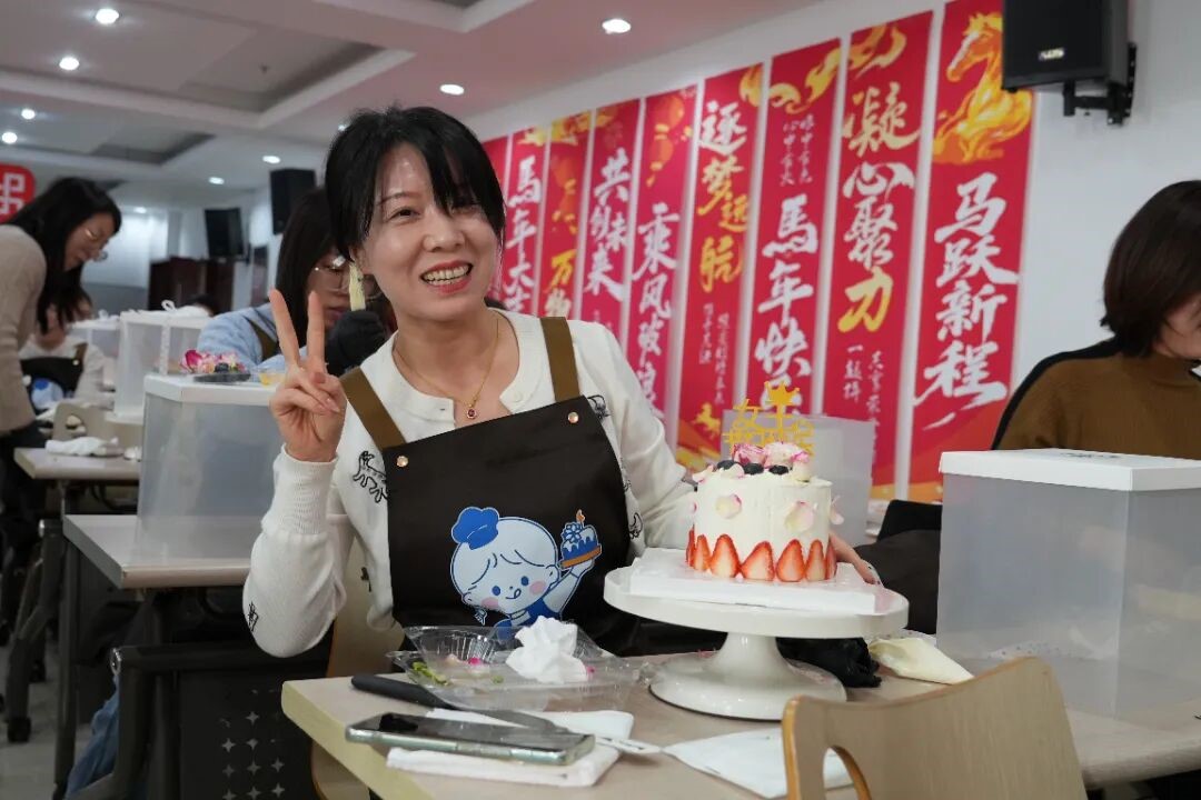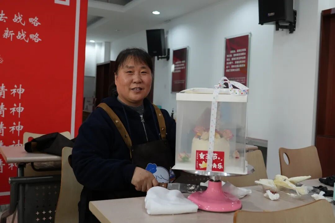 活動現場溫馨雅致,蛋糕坯、淡奶油、新鮮水果、裱花工具等材料一應俱全,專業烘焙老師現場從蛋糕坯的處理、奶油涂抹技巧,到裱花裝飾手法、水果色彩搭配,逐一細致講解、分步示范,耐心解答大家提問。平日里奮戰在技術前沿和管理崗位的女職工們,此刻化身“甜品師”,抹奶油、鋪夾心,擺水果、創意裱花……每一步都傾注巧思與心意。大家互相交流、彼此協助,歡聲笑語不絕于耳,空氣中彌漫著香甜氣息與節日溫情。